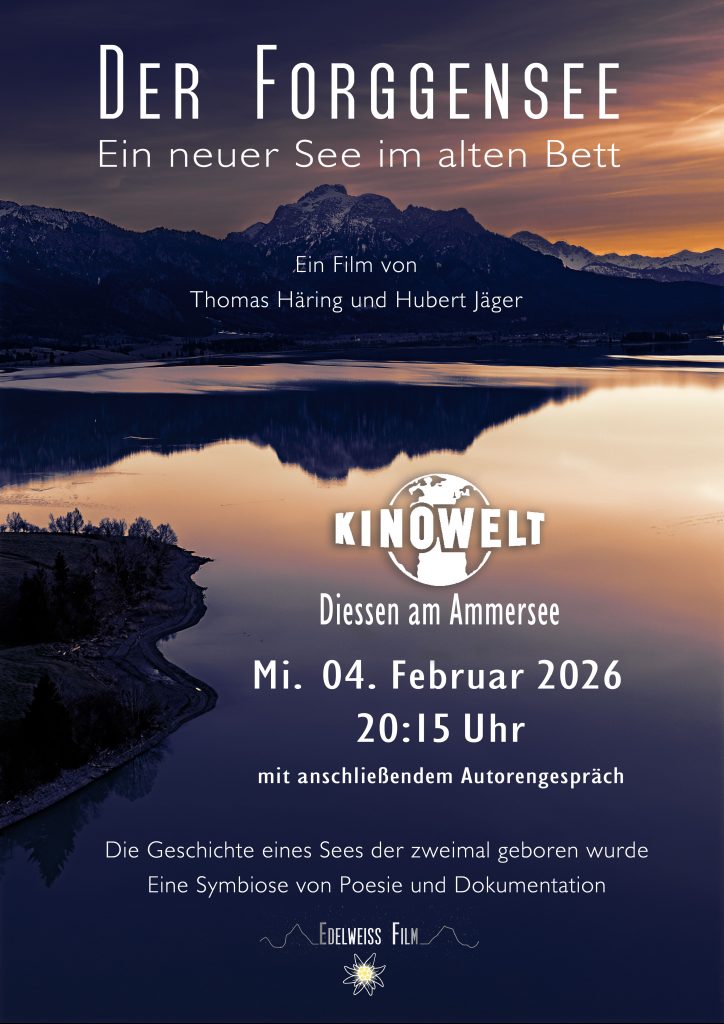 1954 wurde der Lech von Rosshaupten bis Füssen zum Forggensee aufgestaut, Deutschland größter Stausee war geboren. In einer Symbiose von Poesie und Dokumentation erzählt der Film die außergewöhnliche Geschichte vom Werden und Vergehen eines Sees der zweimal geboren wurde. Es ist mehr als nur eine Dokumentation – denn der Forggensee selber erzählt in eigener poetischer Sprache seine ureigenste Geschichte. Aufwendig restauriertes historisches Filmmaterial macht die Vergangenheit lebendig. Verlust und menschliche Tragödien. Ein Kampf zwischen Bewahrung und Fortschritt. Neu erzählt. Neu verfilmt. Tickets und Reservierung unter Kinowelt Diessen am Ammersee